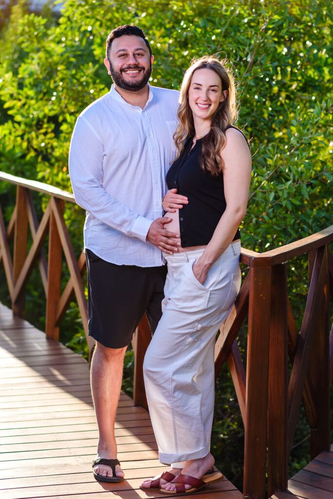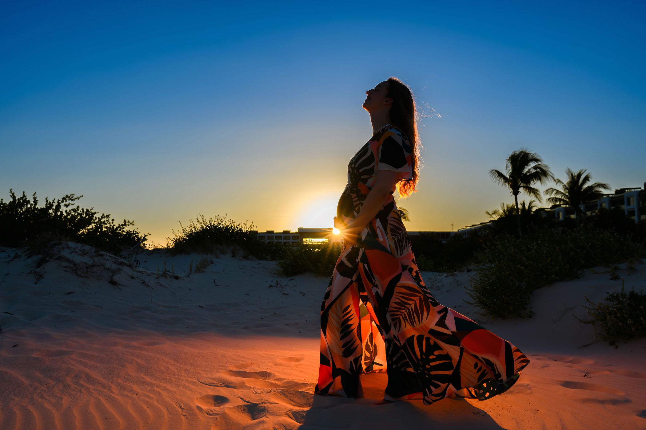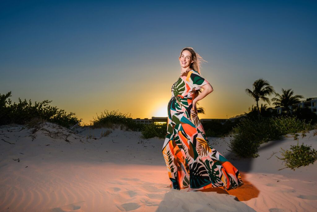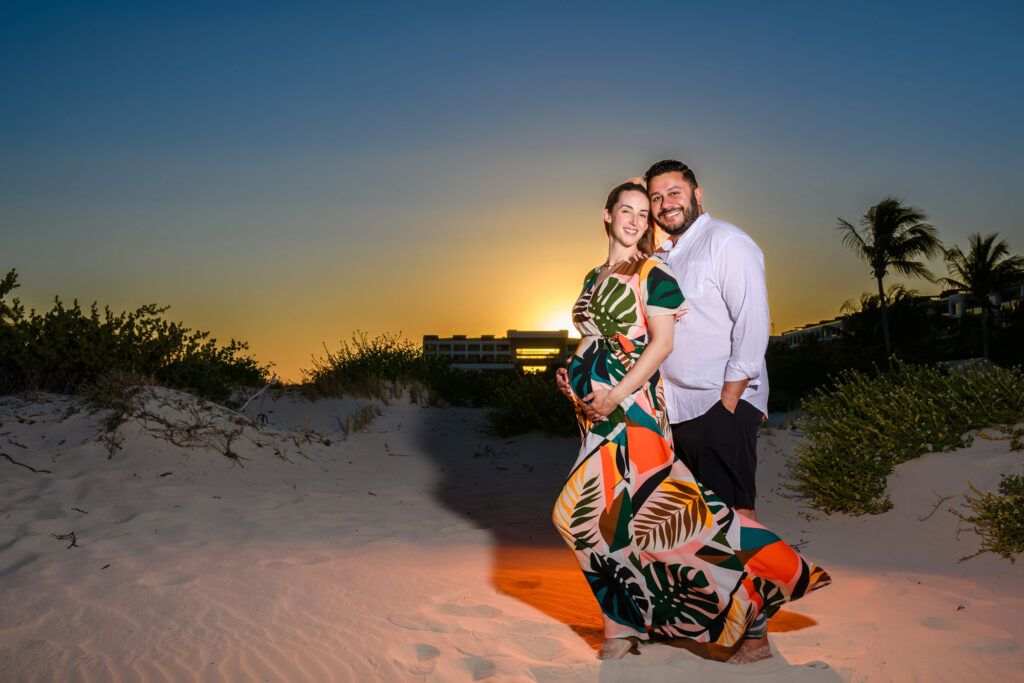 Set against the breathtaking scenery of Playa Mujeres and the Riviera Maya, this maternity session unfolded in golden Caribbean light. As the sun dipped into the horizon, warm hues of amber and blush surrounded a mother-to-be standing gracefully between modern architecture and the tranquil sea.