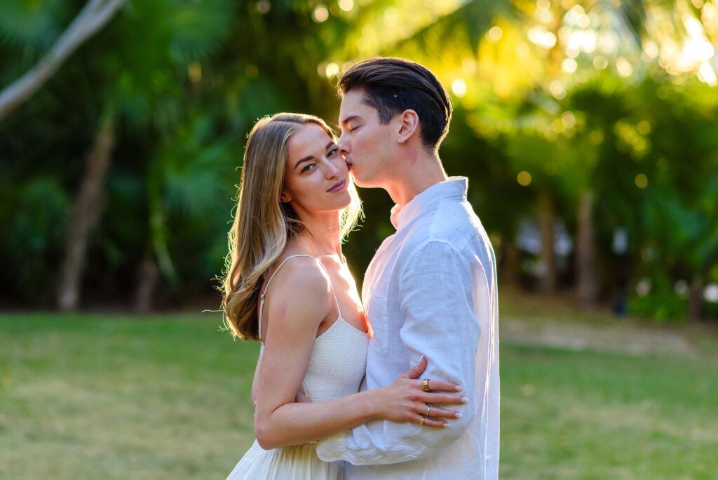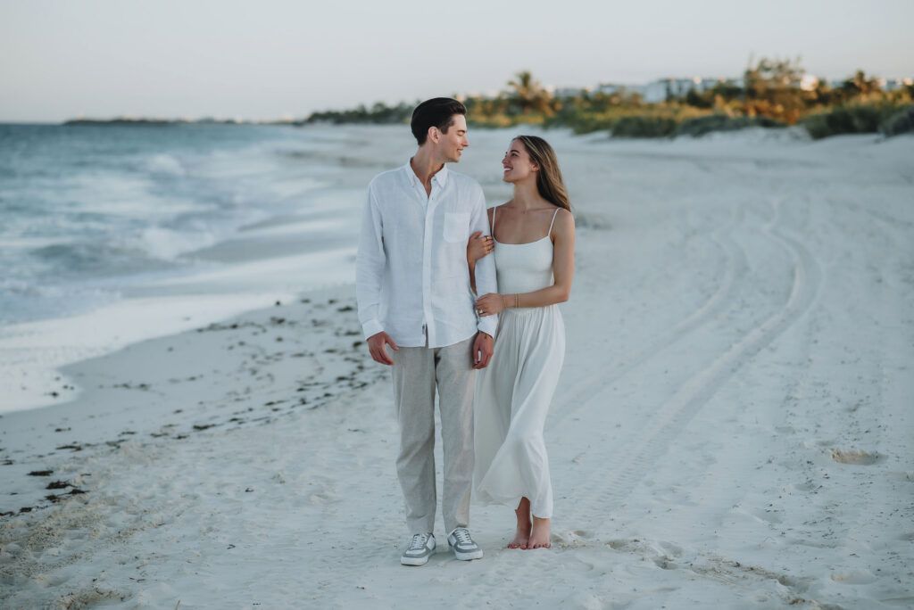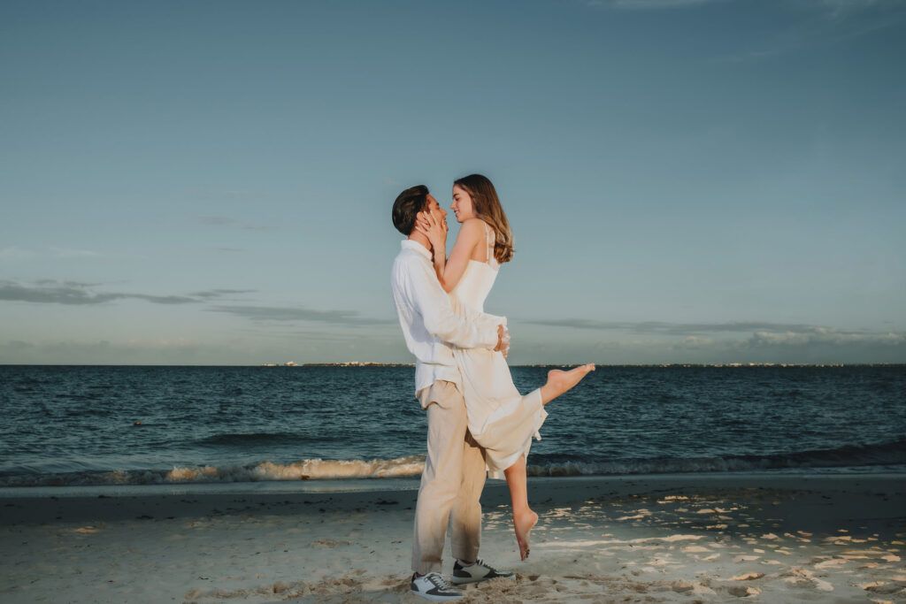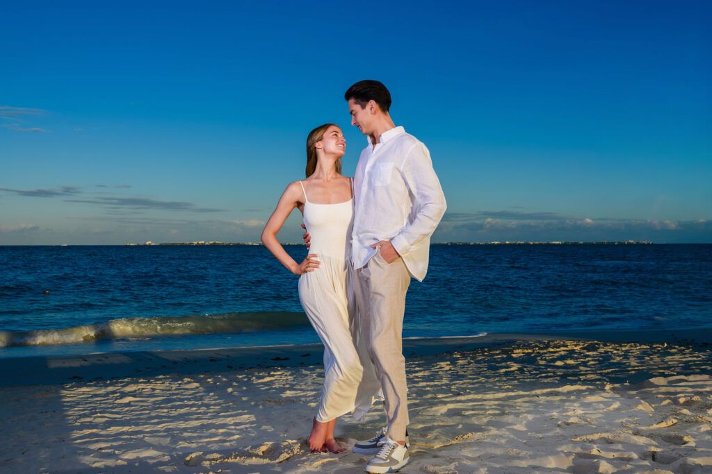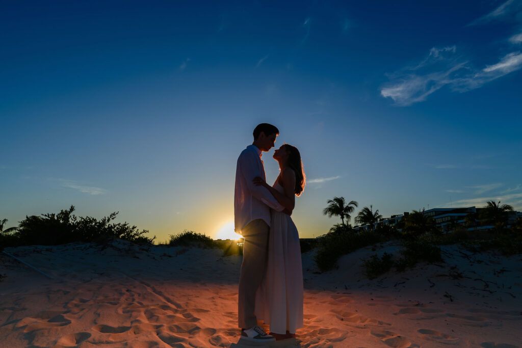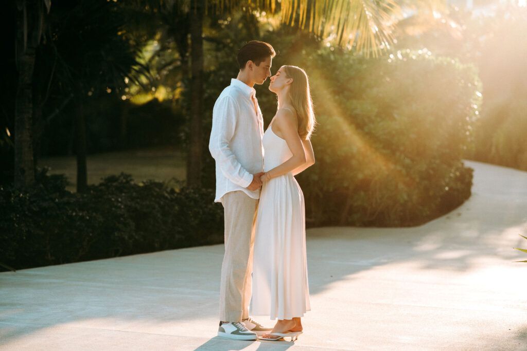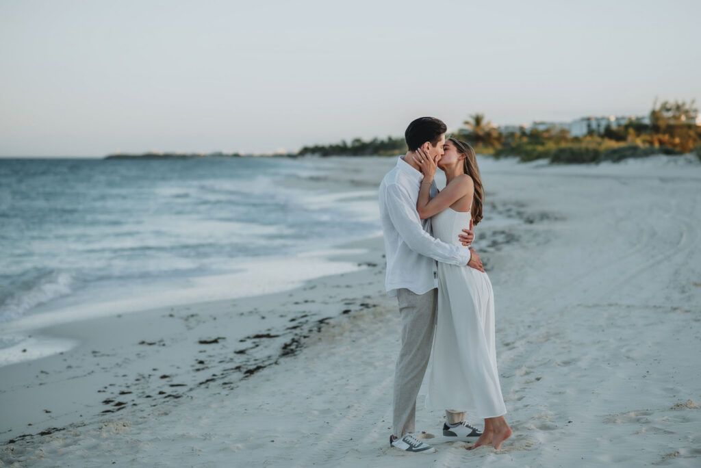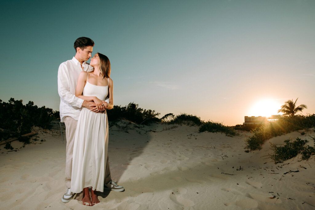 This Save The Date photography session in Cancun was designed to reflect the couple’s essence — natural, sophisticated, and deeply connected. With the Caribbean breeze as witness and golden light embracing every frame, we focused on capturing authentic moments that represent the beginning of their wedding journey.